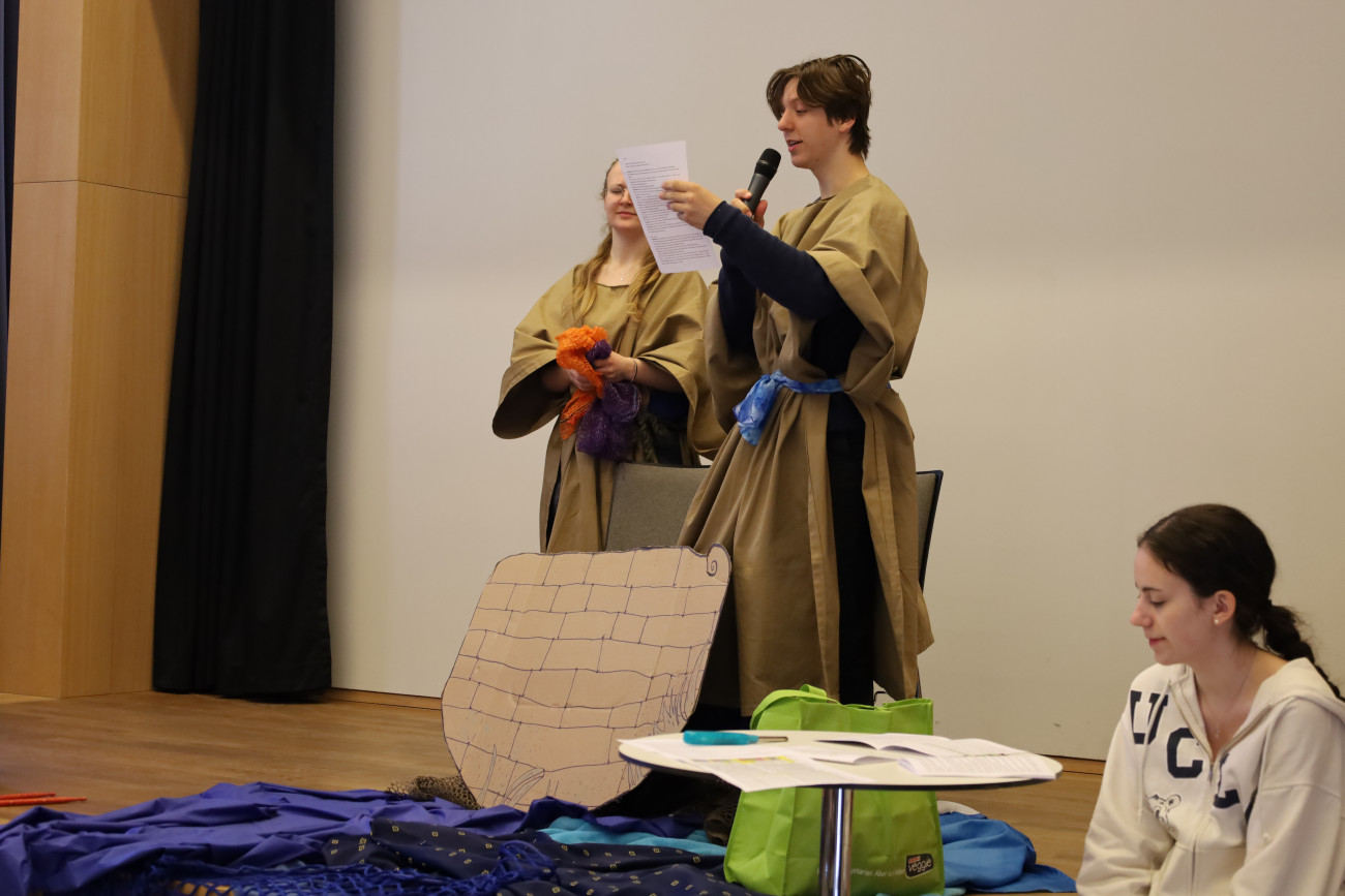 Ein besonderes Merkmal der diesjährigen KiBiWo: das gemeinsame Taschentuch. Jedes Kind erhielt ein eigenes Stück Stoff, das im Laufe der Woche Bild für Bild mit Motiven aus den Geschichten gestaltet wurde – Fisch, Wellen, Fußabdruck, Knoten. Ein handfestes Erinnerungszeichen.
